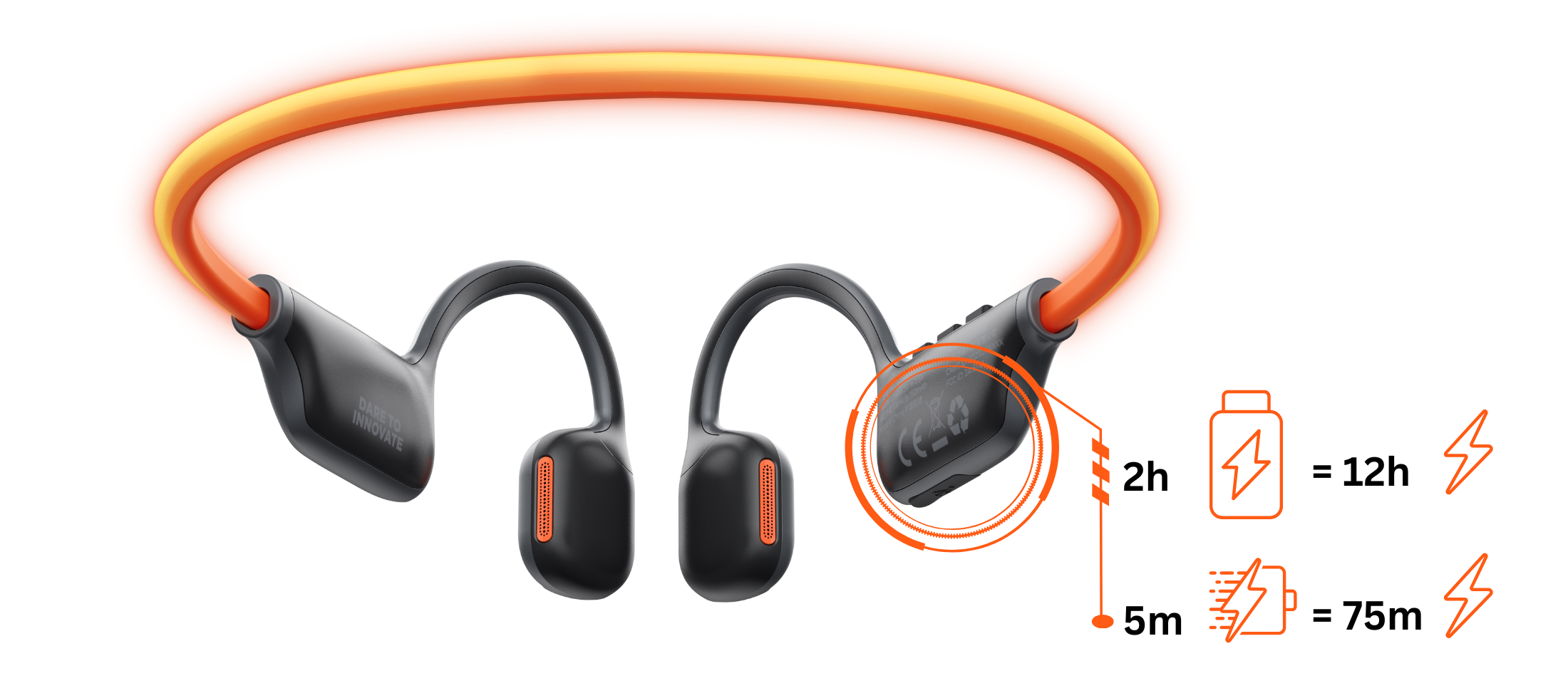 Profitez de 75 minutes de lecture musicale avec seulement 5 minutes de charge rapide. Une charge complète en 2 heures vous offre jusqu'à 12 heures d'écoute ininterrompue.