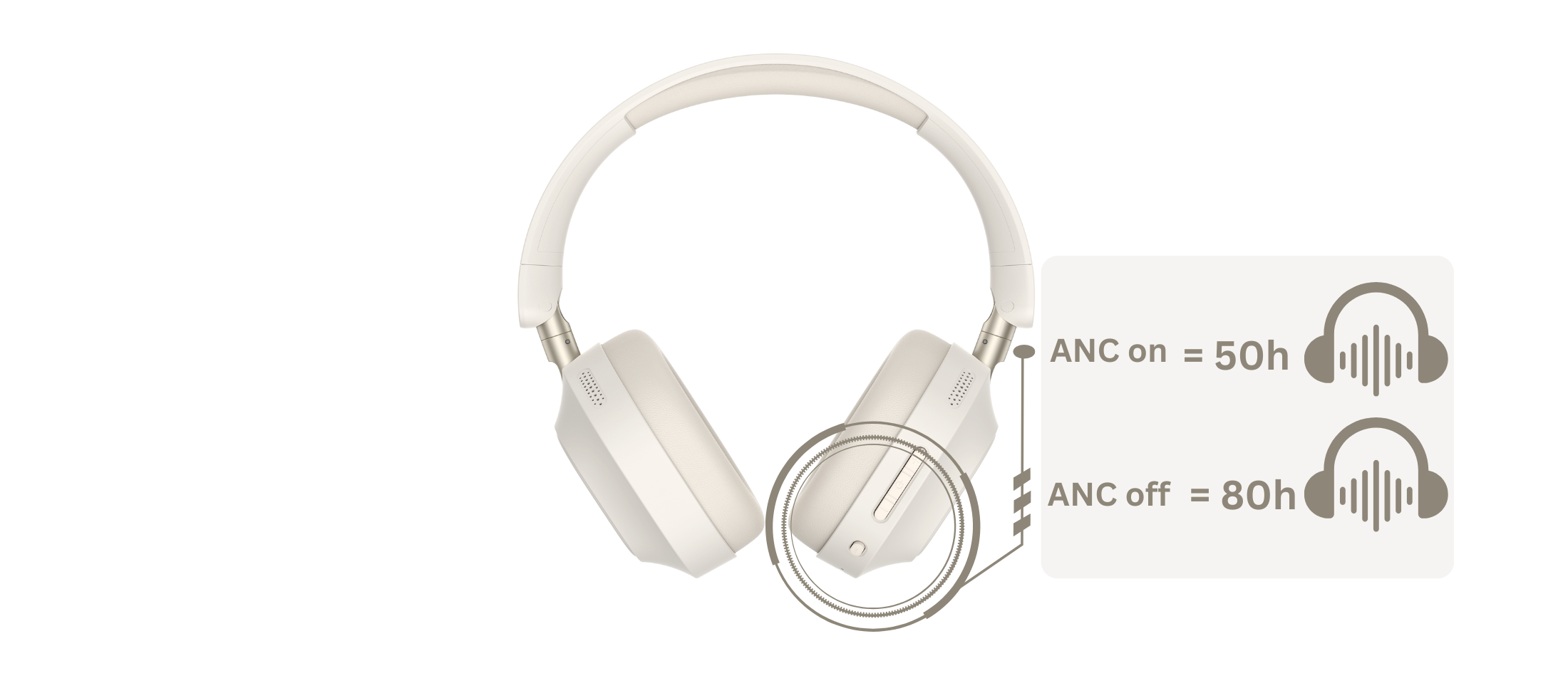🔘80 heures de liberté. Utilisez votre casque toute la semaine sans vous soucier de le recharger, même avec ANC* activé (50 heures).